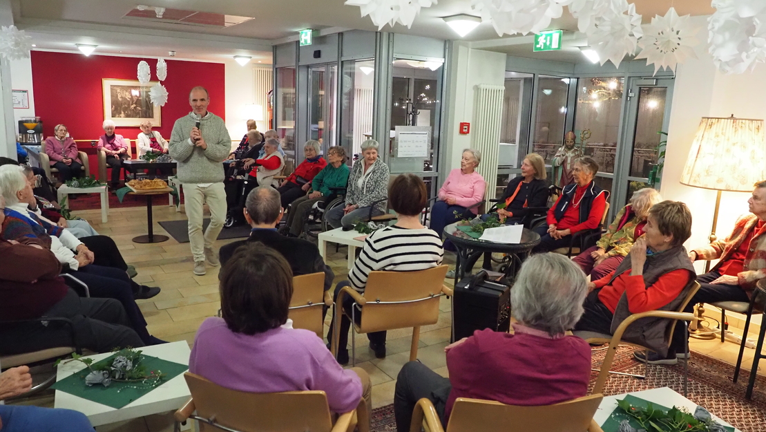 Es handelt sich um ein Angebot an die Bewohnerinnen und Bewohner, den Tag in fröhlichem Miteinander ausklingen zu lassen“, erläutert Pflegedienstleiter Reinhold van Weegen, der die Abendrunden Ende 1994 aus der Taufe gehoben hat. Die Teilnehmenden singen und spielen, rätseln und erzählen, bekommen etwas vorgelesen und üben sich in Bewegung. Zwischendurch gibt es eine Getränkerunde. Auch ein Gläschen Wein ist dabei, für den dermag.