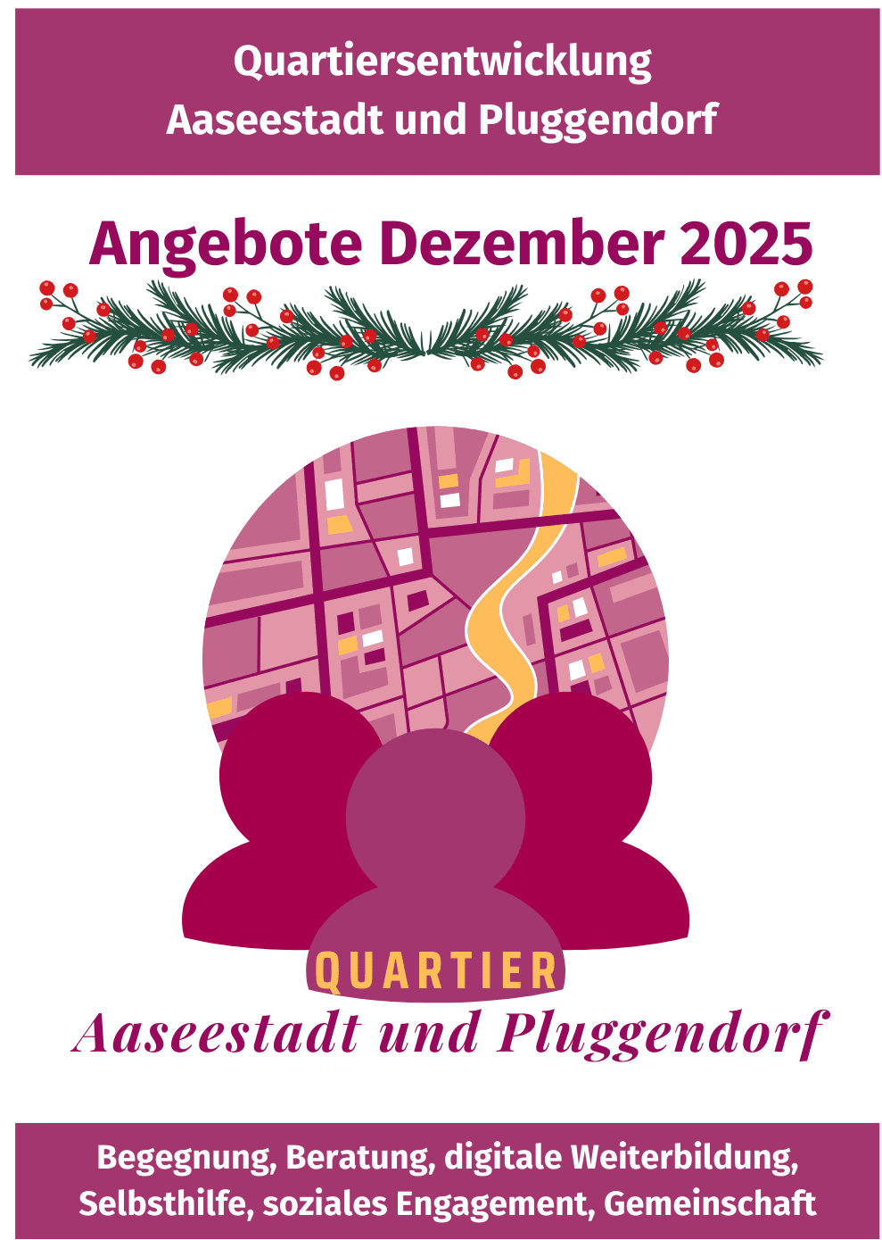 Die Quartiersentwicklung Aaseestadt und Pluggendorf bietet ein vielfältiges Programm für Begegnung, Beratung und gemeinsames Engagement. Ob offene Treffpunkte, Selbsthilfegruppen, digitale Weiterbildung oder Informationsveranstaltungen und Beratungsangebote – hier können Sie neue Menschen kennenlernen, sich informieren und aktiv werden. Bringen Sie sich ein und gestalten Sie Ihr Quartier mit!
