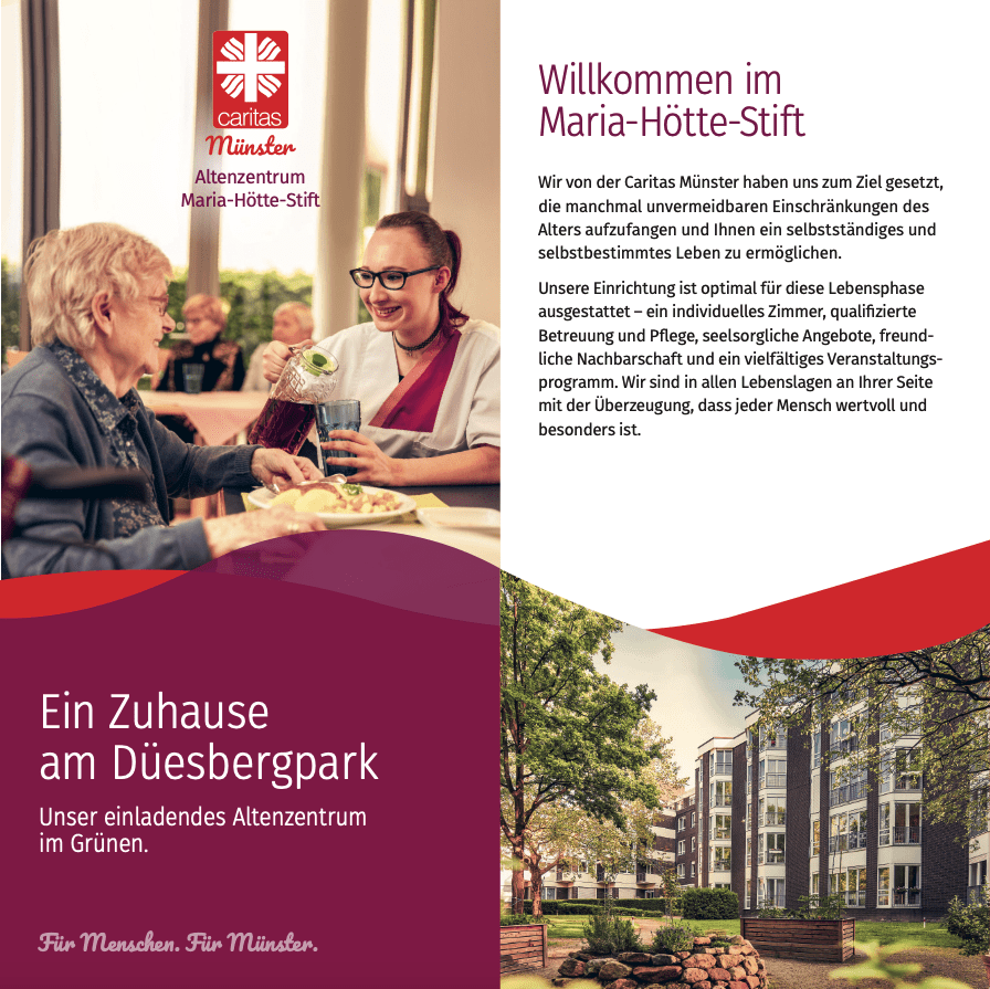 Wir von der Caritas Münster haben uns zum Ziel gesetzt, die manchmal unvermeidbaren Einschränkungen des Alters aufzufangen und Ihnen in unserem Altenzentrum ein selbstständiges und selbstbestimmtes Leben zu ermöglichen. Das Altenzentrum Maria Hötte Stift liegt am Düesbergpark. Unsere Einrichtung ist optimal für diese Lebensphase ausgestattet – ein individuelles Zimmer, qualifizierte Betreuung und Pflege, seelsorgliche Angebote, freundliche Nachbarschaft und ein vielfältiges Veranstaltungsprogramm.
